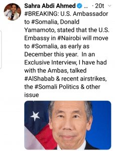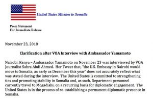 ka soo baxay Xafiiska Safiirka Mareykanka u qaabilsan Somaaliya ee fadhigiisu yahay Magaalada Nairobi ee Dalka Kenya ayaa lagu sheegay, in aanu jirin, oo aanu sax aheyn oo uu yahay been abuur, isla markaana anu ku jirin wareysigii uu bixiyey Safiirka Mareykanka u qaabilsan Somaaliya Mr. Yamamto, oo lagu sheegay in safaarada Mareykanka loo soo raraayo Gudaha Somalia bisha December 2018, warkaasina uu gaar ku yahay wareyihii Voa-laanta Somaaliga ee wareysiga qaaday Sahra Cabdi Axmed.