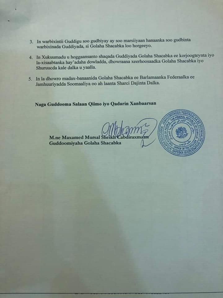 Guddoomiye Mursal ayaa sidoo kale xukuumadda ku amray in ay u hoggaansato hawlaha guddigaasi hayo,islamarkaana la ilaaliyo madax-bannaanida Baarlamanka oo ah laanta sharci-dejinta dalka.