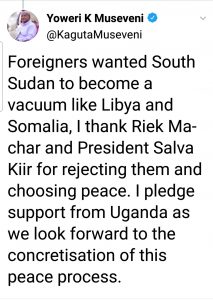 Madaxweyne Museveni oo ka qeyb galay dhaqan gelinta heshiiskii nabada ee la dhex dhigay Madaxweynaha South Sudan Salva Kiir iyo Madaxweyne ku xigeenkiisa Riek Machar ayaa bartiisa uu ku leeyahay Twitter ku tibaaxay weerahan :