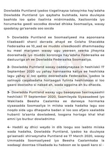 Dowlada Puntland ayaa Qoraal kasoo saartay Xaalada Soyaasadeed ee Soomaaliya, Qoraalka ayaa lagu sheegay in Xalka kaliya ee Muranka hada taagan uu yahay Heshiiskii 17 Sebtembar oo la meel mariyo.