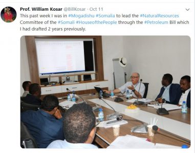 Prof William oo ah Khabiir iyo Dilaal dhanka sharciga ah oo ka qaraabta dalalka Africa ee khalalka iyo deganaansho la’aanta Siyaasadeed ka jirto ayaa barta uu ku leeyahay barta Bulshada ee Twitterka inuu usbuucan ku sugan yahay magaalada Muqdisho, isagoo gudiga Kheyraadka Dabiiciga ah ee Barkamaanka Somaaliya uu u akhrinaayo xeerka shidaalka ee uu isagu qoray.