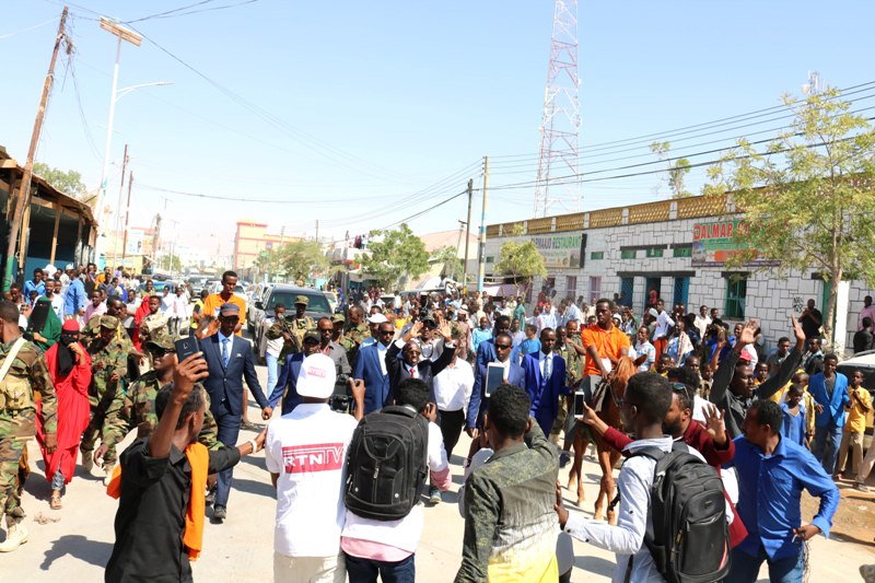 Intaas kaddib, waxaa musharraxa loo soo galbiyey dhanka Fagaaraha Barxadda, halkaasoo uu kula hadlay boqollaal kamid ah dadwaynaha ku dhaqan Garoowe. Musharraxa ayaa ka mahadceliyey sida diirran ee loo soo dhoweeyey, isagoo xusay in marnaba aanu hilmaami doonin taageerada ay reer Garoowe u muujiyeen.