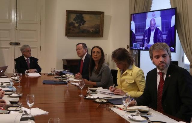 Chile’s President Sebastian Pinera, flanked by Minister of Foreign Affairs Roberto Ampuero, looks at a screen as they await the decision by The Hague over a maritime dispute with Bolivia, in Santiago, Chile, Octob